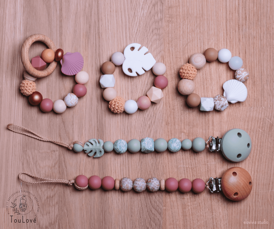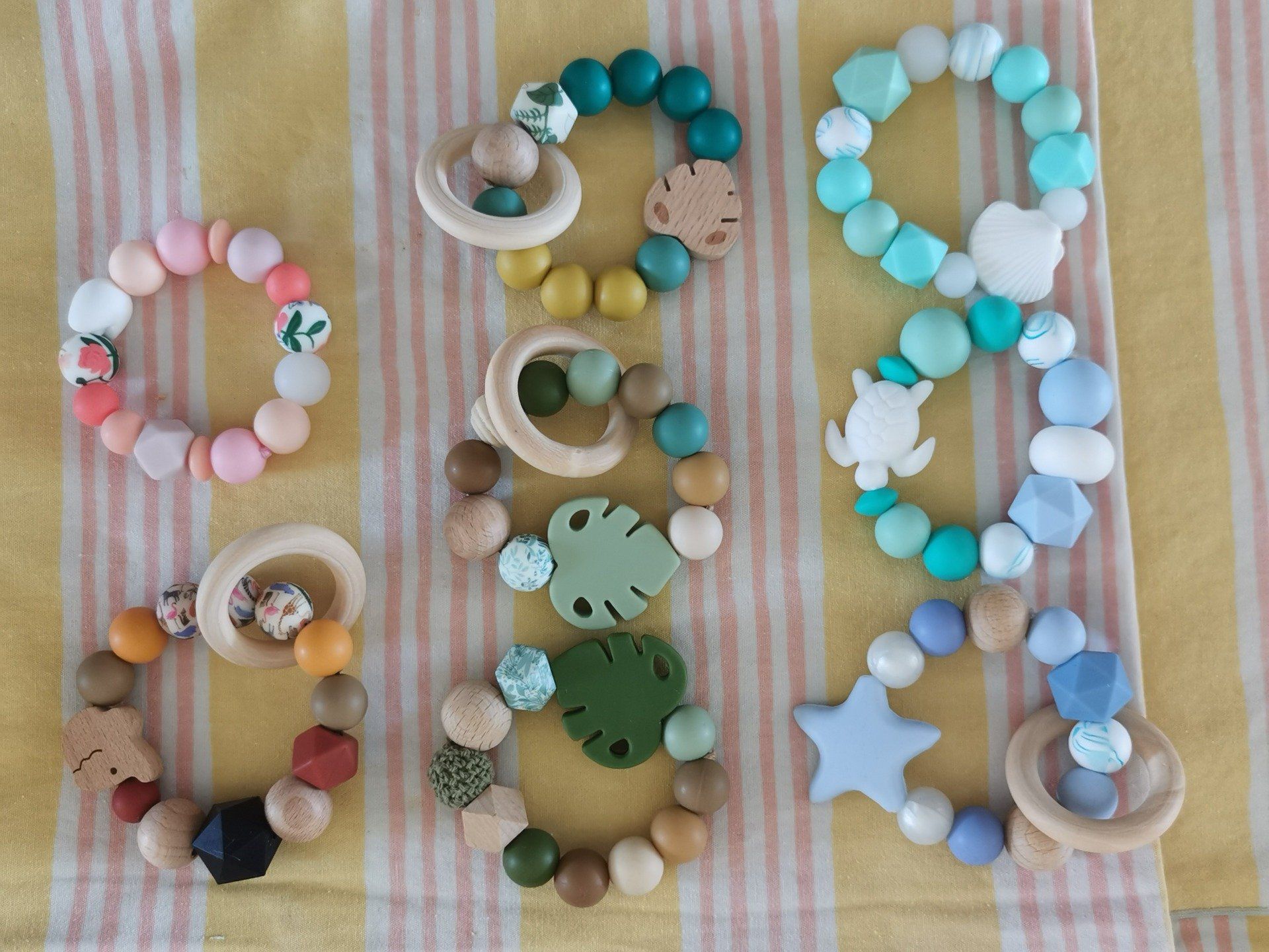 Ce joli anneau de dentition contribue au développement de la mâchoire de votre bébé et prend soin de sa petite bouche. Il se compose de perles en silicone et bois. Demandez votre thème !
